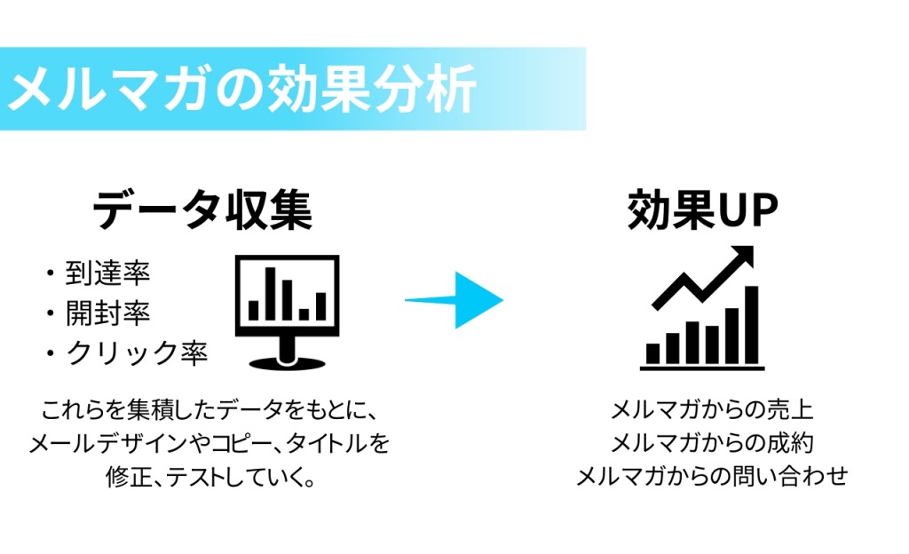 まずは到達率を上げメールが全員に届くよう整備する、どんな内容、件名、配信時間、配信頻度だとメールが読まれやすいのか分析、クリック率の高い読者層、クリックされやすいデザインなどのデータを集積・改善していくことが大切です。