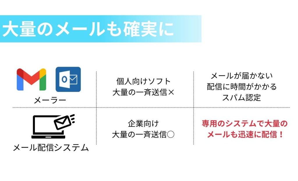 また、GmailやOutlookといったメーラーは数百件を超えるような一斉送信の利用は想定していないので、一斉送信を頻繁に行っていると配信遅延が起きたり、送信制限がかけられたりします。
